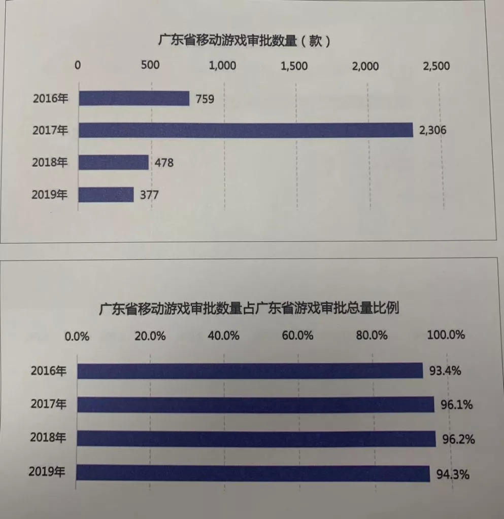 具体来看,广东省移动游戏审批量约377款,占广东省游戏审批总量的94.3%,与2018年过审数478款相比,减少了101款。