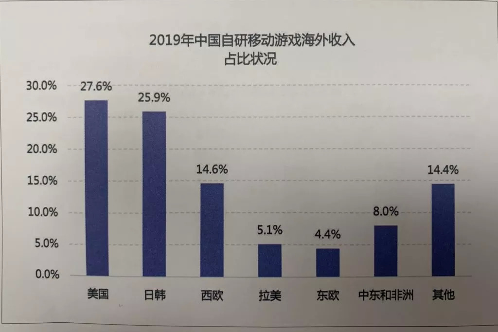 从地区分布来看,中国移动游戏出海的主要市场为美国和日韩地区,其收入规模均超过20亿美元,其中美国市场的收入占比为27.6%,日韩市场的收入占比为25.9%,排在其后的还有西欧、拉美、东欧等市场。