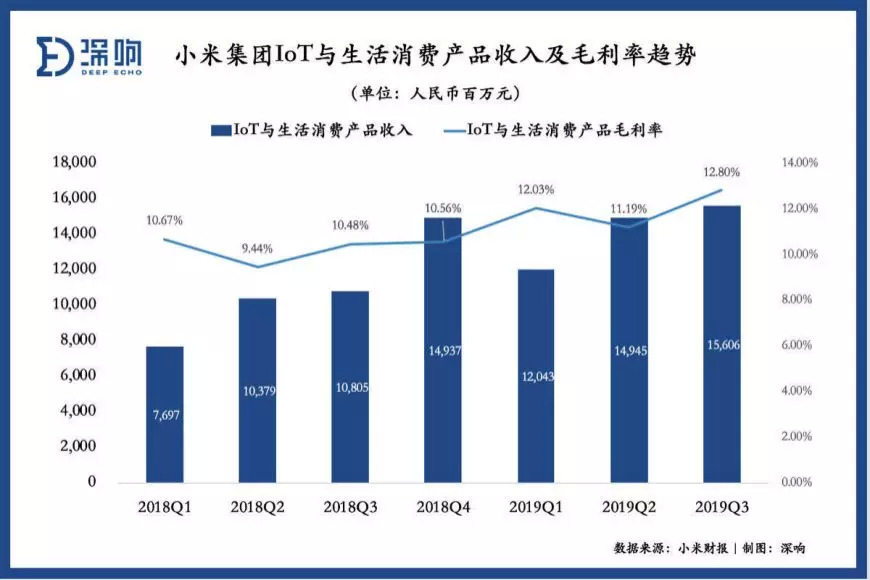 转眼六年时间,率先提出AIoT(AI人工智能+IoT物联网)的小米在IoT领域站稳脚跟,成为AIoT智能生活的定义者。根据最新季度财报(Q3),小米IoT于生活消费产品部分收入为156亿元,同比大幅增长44.4%。而在2019年的前三季度中,IoT累计为小米贡献425.9亿元,在总收入中占比28.5%,相比2017年的20%和2018年的25%,也有着稳步增长。