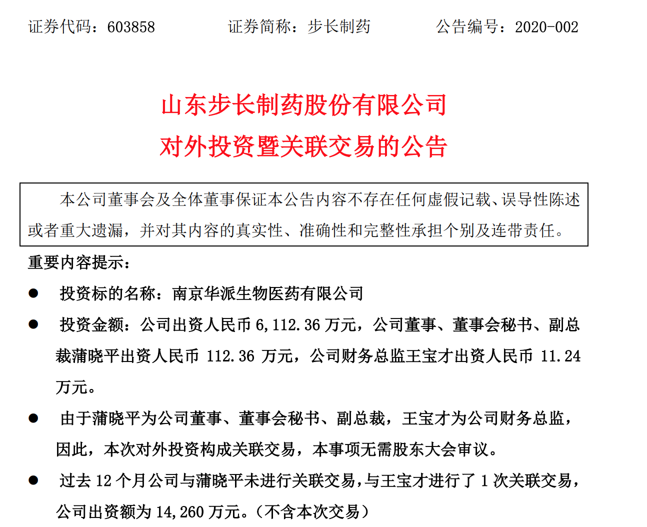 此外,为了在此次投资中调动各方积极性,步长制药的董事、董事会秘书、副总裁蒲晓平、 财务总监王宝才对本次增资进行跟投。其中,蒲晓平出资人民币112.36万元,增资完成后,占南京华派注册资本的比例为 1%;王宝才出资人民币11.24万元,增资完成后占南京华派注册资本的比例为 0.1%。