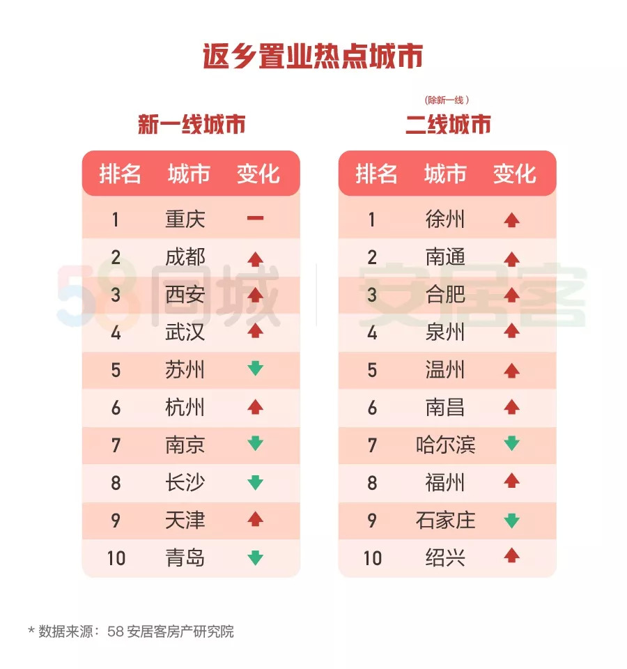 其他二线城市中,徐州位列返乡置业热门城市首位,南通、合肥等城的热度也相对靠前。