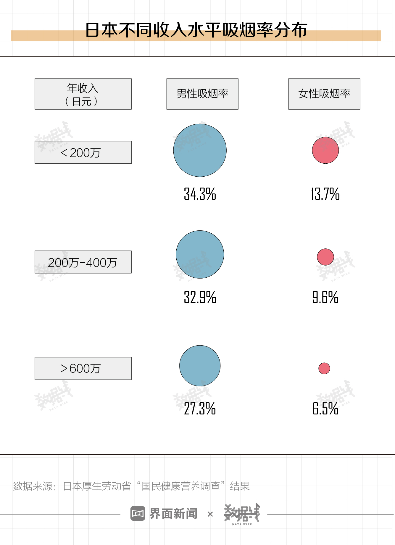 在受访的3000余户家庭中,年收入在200万日元以下的男性吸烟率为34.3%,较年收入大于600万日元的男性高7个百分点;而这一差距在女性吸烟者上更为明显,低年收入女性(<200万日元)吸烟率是高收入女性(>600万日元)的两倍。