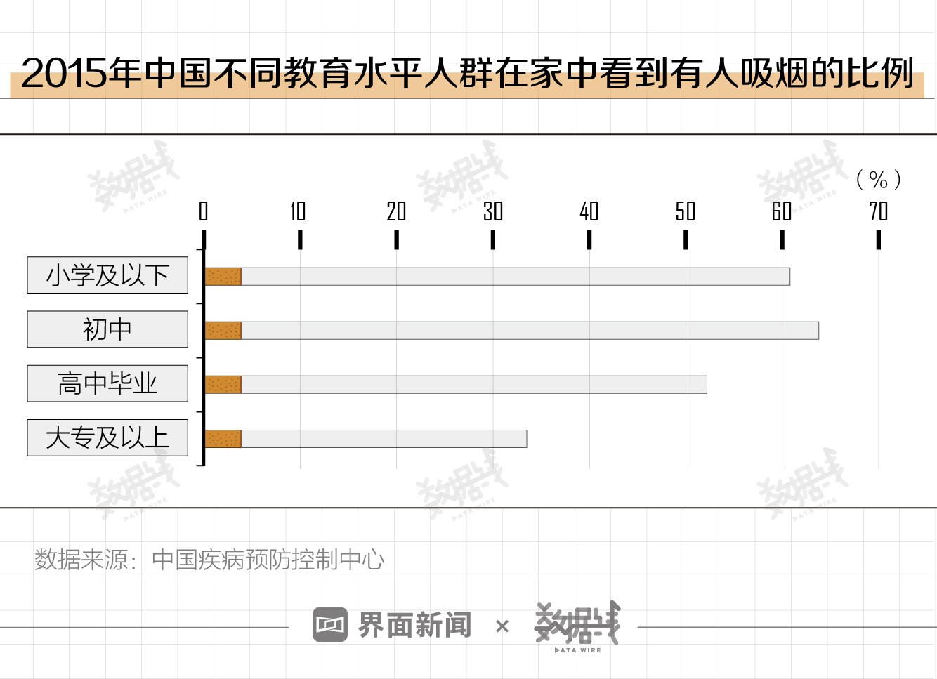 中国疾病预防控制中心数据显示,2015年,在教育水平仅初中毕业或更低的人群中,看到有人吸烟的比例均超60%。