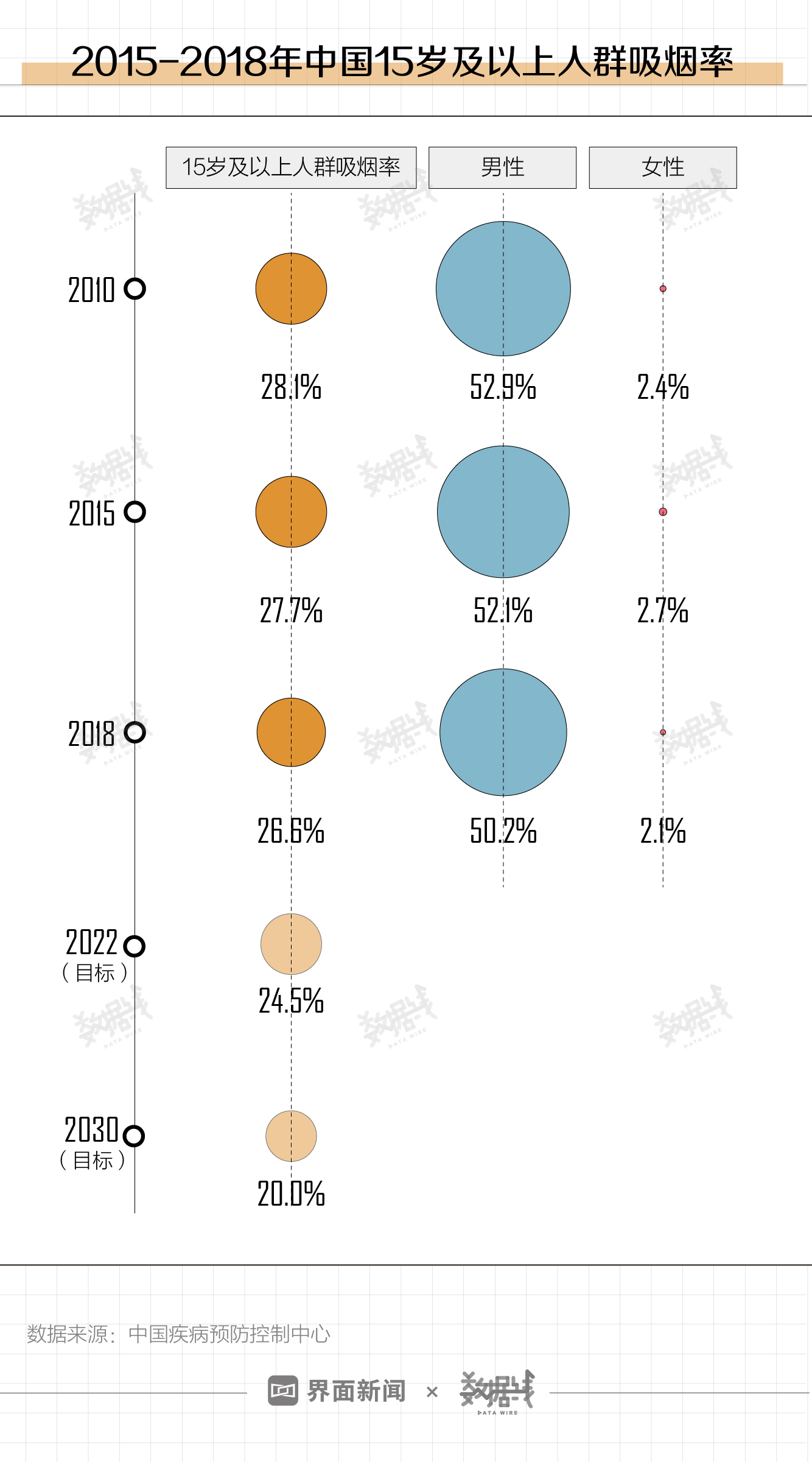 根据中国疾病预防控制中心发布的2018年中国成人烟草调查结果,中国15岁及以上人群吸烟率为26.6%,其中男性为50.5%,女性为2.1%。虽然26.6%的吸烟率与之前相比呈下降趋势,但这一数字距离《“健康中国2030”规划纲要》中明确提出的20%仍存在巨大差距。