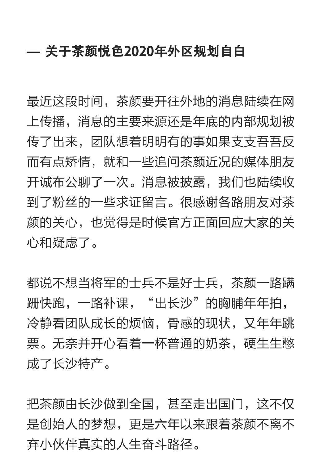 1月18日晚,茶颜悦色官方微博发布声明,确认2020年茶颜悦色将“走出舒适圈”、在长沙以外的开店。按计划,会继续采用直营模式,不加盟,不做代理,以保证品质服务的最优模式。