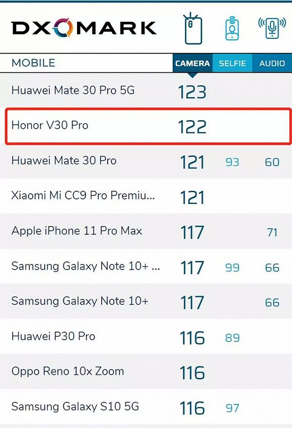 一番挑唆下,荣耀 V30 Pro 被大家起哄般「逼」上 DxOMark 榜单——对,就是跑分小米拿下全球第一那个机构,几天前结果出炉,荣耀 V30 Pro 获得全球第二高分,仅次于 Mate 30 Pro 5G 版,压过小米 CC9 pro、iPhone 一头。