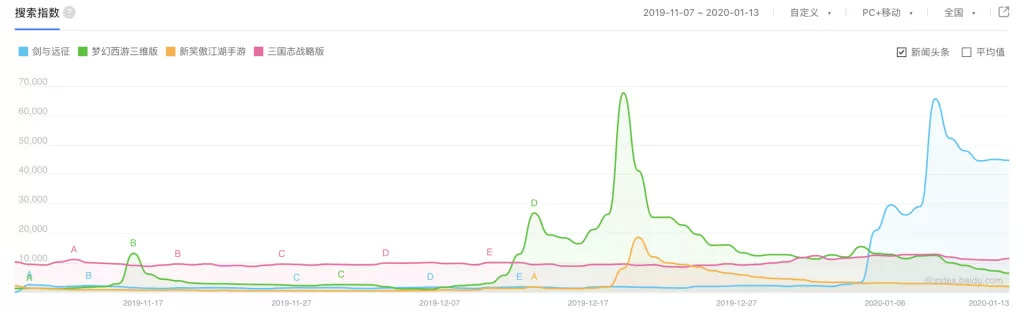 对比几款热门新作,其超6.5w的峰值指数,相当接近「梦幻西游三维版」;同时又明显高于「三国志战略版」等。