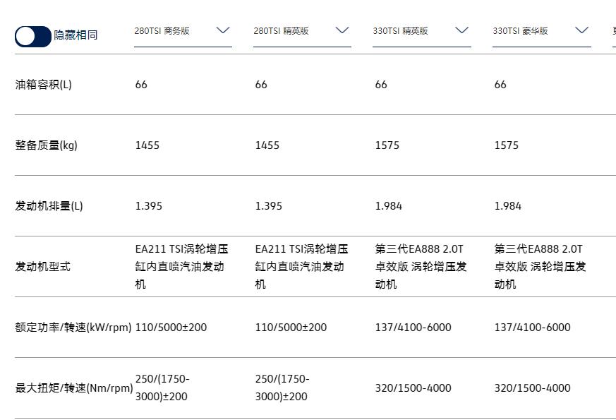 1.4T高功率车型最大马力为110kW,峰值扭矩250N·m。对于2.0T的低功率调校版本,其最大功率为137kW4100-6000rpm,峰值扭矩则达到了320N·m/1500-4000rpm;高功率版本的2.0T发动机最大功率达到162kW,峰值扭矩为350N·m/4500-6250rpm。