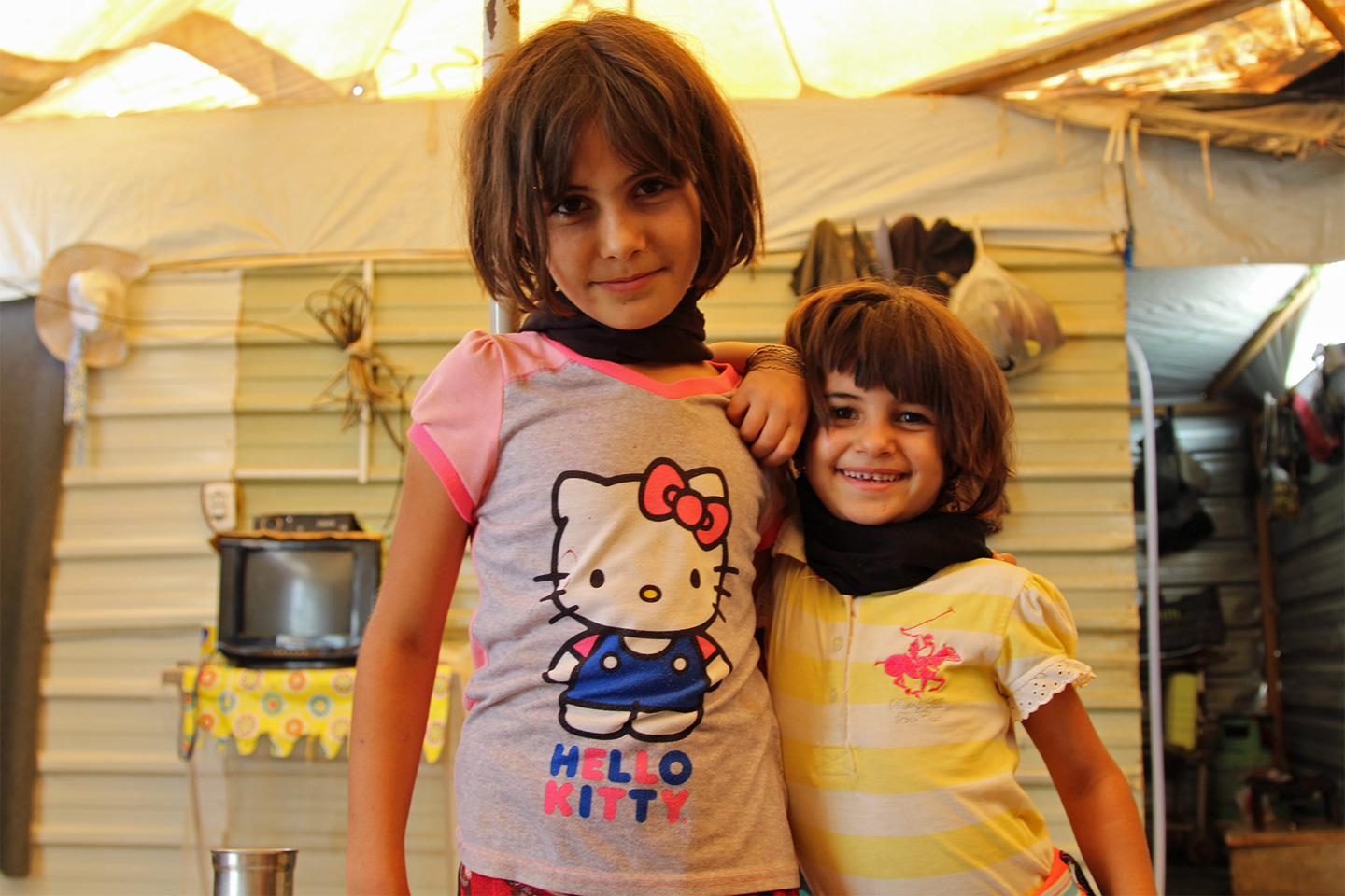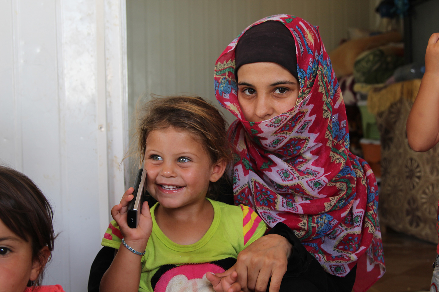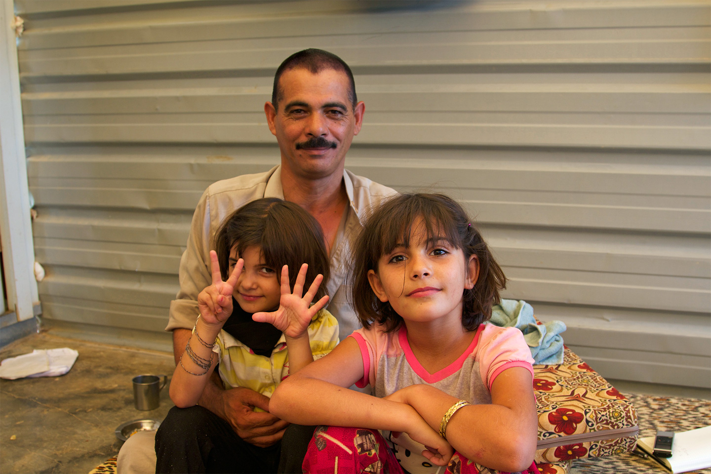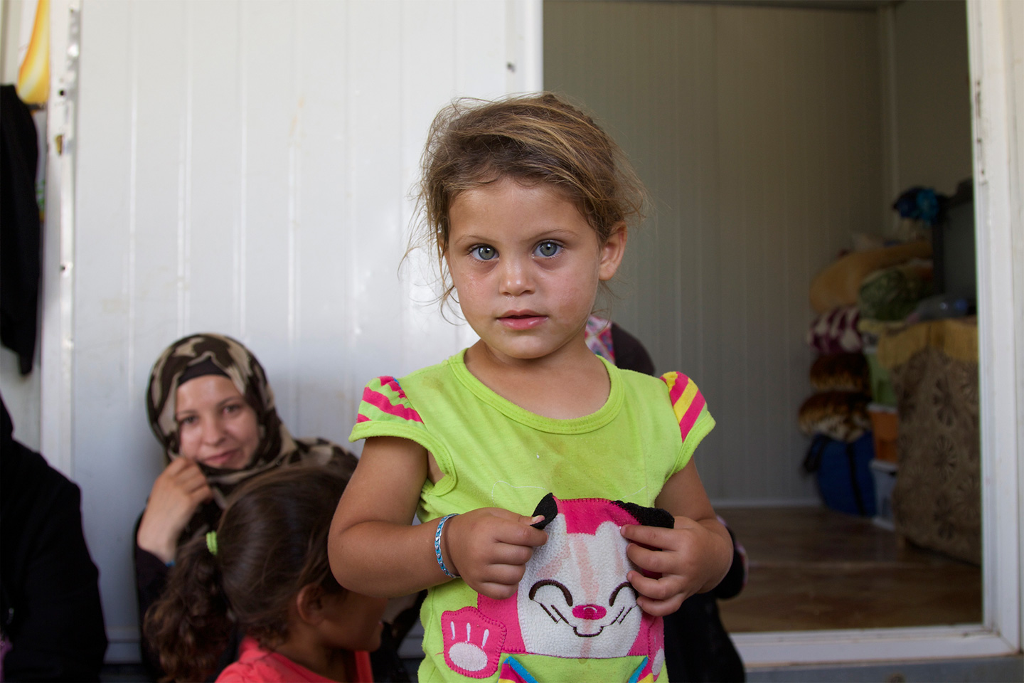 她三岁的女儿艾雅在逃难路上出生,现在在她的膝头扭来扭去。这座板房——伪装成木头材质,窗户上安着木条——是艾雅见过的唯一可以称之为“家”的地方。