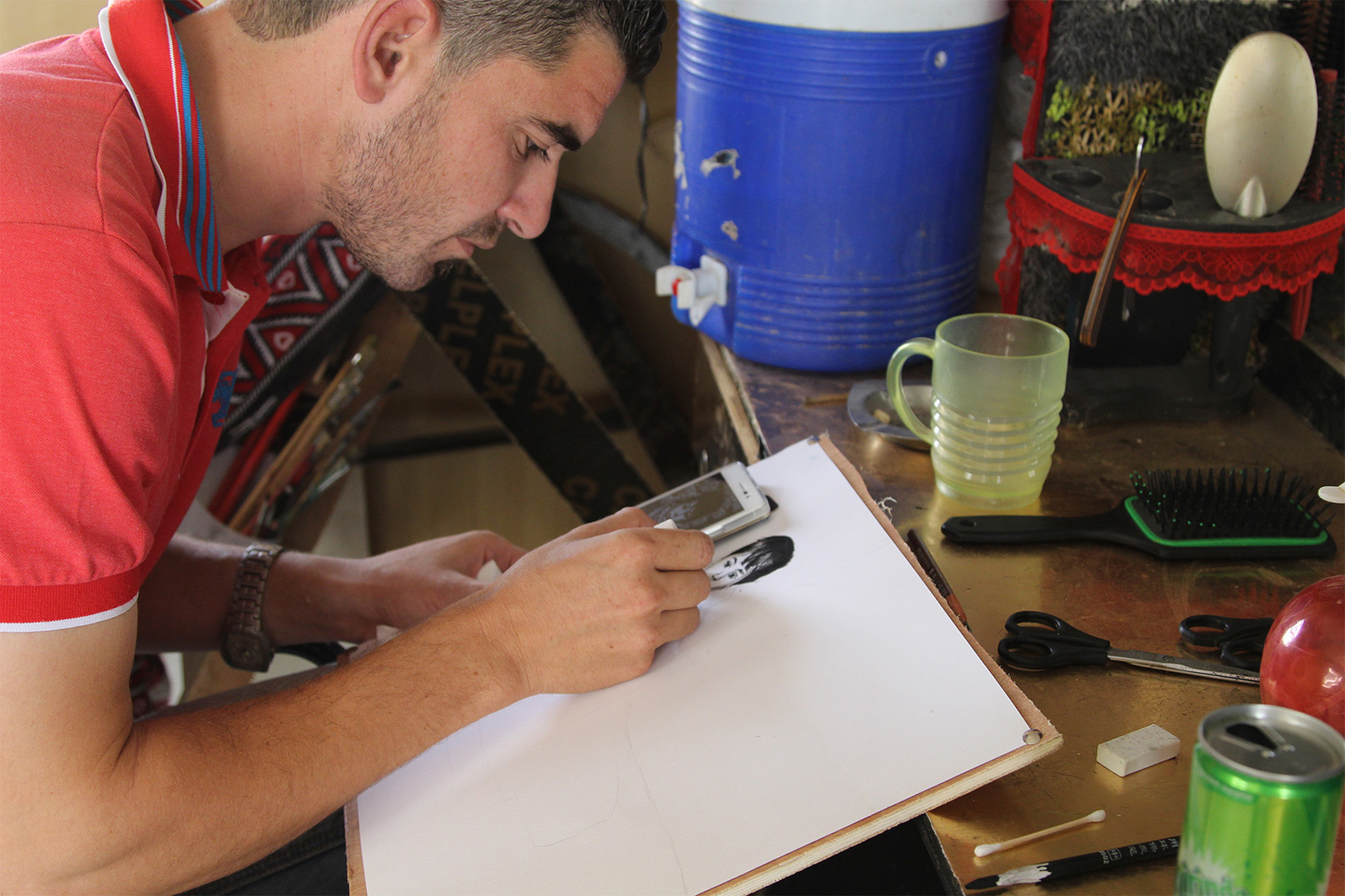 炎热的中午,他蜷缩在理发椅里,照手机里的照片画着一个小男孩的脸。