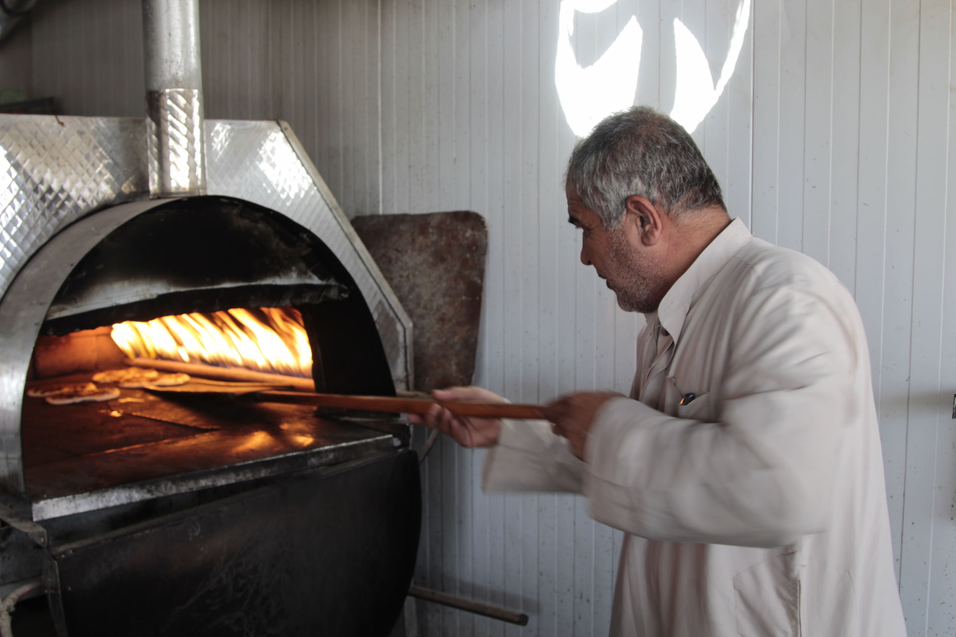 48岁的穆哈德∙阿卡拉特将放有番茄酱、香蒜酱和其它香料的面饼放进通红的烤炉。 他有伊斯兰研究学士学位,是虔诚的信徒,在扎阿塔利难民营的市场里开了一家披萨店。