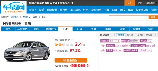 不仅如此,根据车质网投诉回复统计,上汽通用对投诉的回复率达97.2%,但车主满意度却仅为2.4分,属于中下等水平。