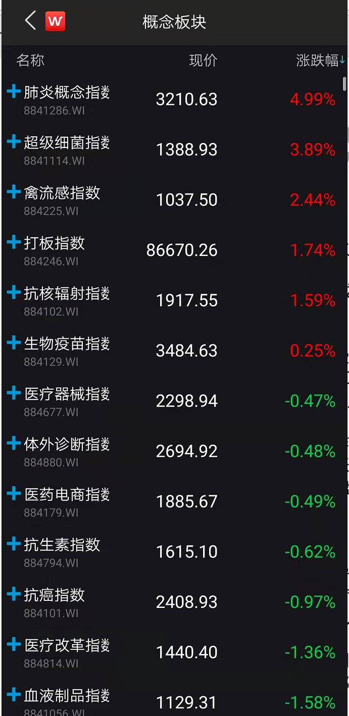 盘面上,各行业板块全线皆墨。然而依然有部分概念板块受到避险资金青睐,领涨两市。其中,肺炎概念板块涨幅近5%,哈药股份(600664.SH)、东北制药(000597.SZ)、阳普医疗(300030.SZ)等多只个股涨停。