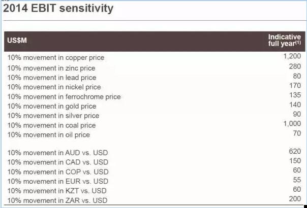 而嘉能可拥有极大的铜风险敞口。该公司在2013年的年度财报中表示,如果铜价下跌10%,那么公司的税息折旧及摊销前利润(EBITDA)就将被抹去12亿美元。同时,按照前银河期货首席宏观经济顾问付鹏的看法,根据嘉能可2014年的财报,如果一揽子汇率对美元贬值10%,那么汇率波动对嘉能可的税息折旧及摊销前利润(EBITDA)就将被抹去11.4亿美元!而从2014年到目前,一揽子货币对美元平均贬值均超过了20%,这意味着至少汇率对EBITDA敞口至少这两年被抹去了25亿美元。