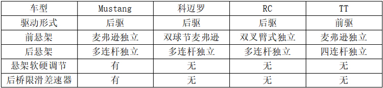 跑车的驾驶质感与悬架和驱动形式有密切关系。四款跑车都是采用后多连杆独立悬架,但前悬架略有不同,科迈罗和雷克萨斯RC分别采用双球节麦弗逊前悬架和双叉臂式独立悬架,操控指向更好,而福特Mustang和奥迪TT的前悬架都是麦弗逊独立悬架。