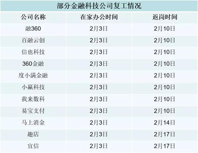 还有些金融科技公司员工返岗时间较晚。马上消费金融表示,员工2月3日起在家办公,暂定2月14日到职场;宜信则2月3日-2月14日在家办公,2月17号返岗工作;而趣店同样于2月3日起在家办公,2月17日返岗工作。