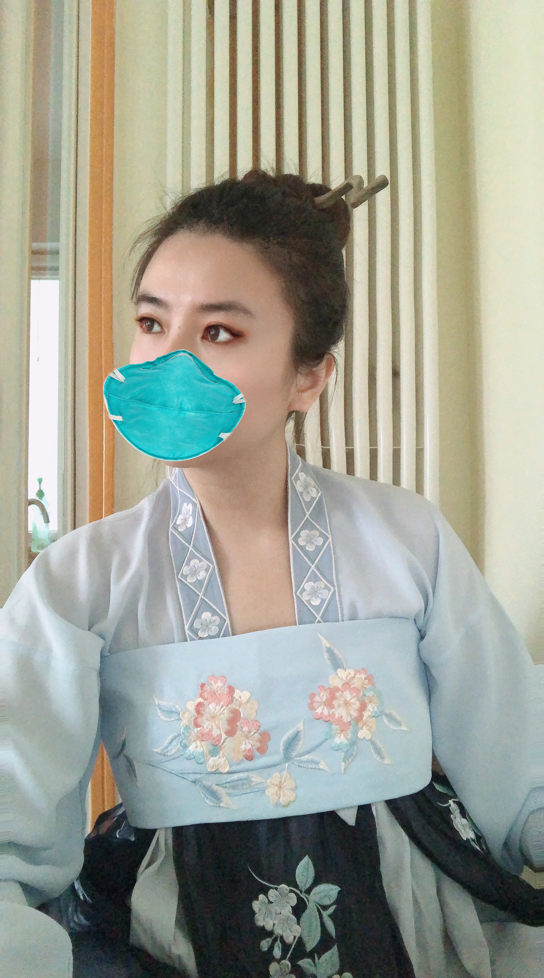 说句玩笑话,汉服穿着的繁琐十分有利于消磨时间和锻炼身体,这真是禁足后居家生活的福音。我的汉服是齐胸襦裙,这个称呼是现在圈子里的惯常称呼,但要考古,它其实是高腰衫裙,属于隋唐制,包括一件上襦、高腰衫裙,如果你很冷,可以在外面加外套、围巾和飘片。