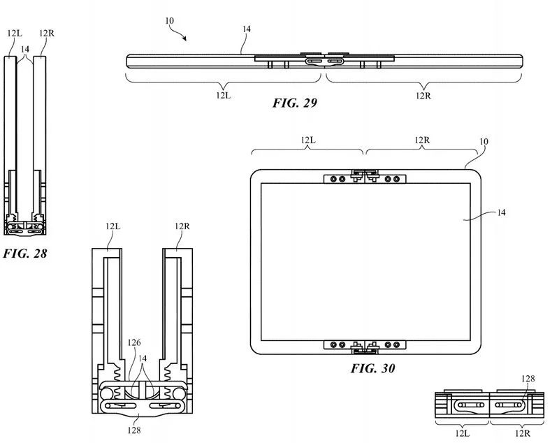 据专利文件显示,苹果设计的铰链机构可以让显示器的第一部分和第二部分充分分离。在内部,铰链可控制显示屏的移动,从而在铰链处弯曲,使用空隙部分为屏幕提供扩大弯曲所需的空间。机架和齿轮装置可用于保持外壳和显示屏与静态区域中每个折叠元件的距离,以及强制实现所需的弯曲半径。展开时,可伸缩的翻盖可以在内部延伸以支撑该位置的显示屏,因此,按一下手指不会影响屏幕的位置,也不会使屏幕疲劳,超出正常使用的范围。