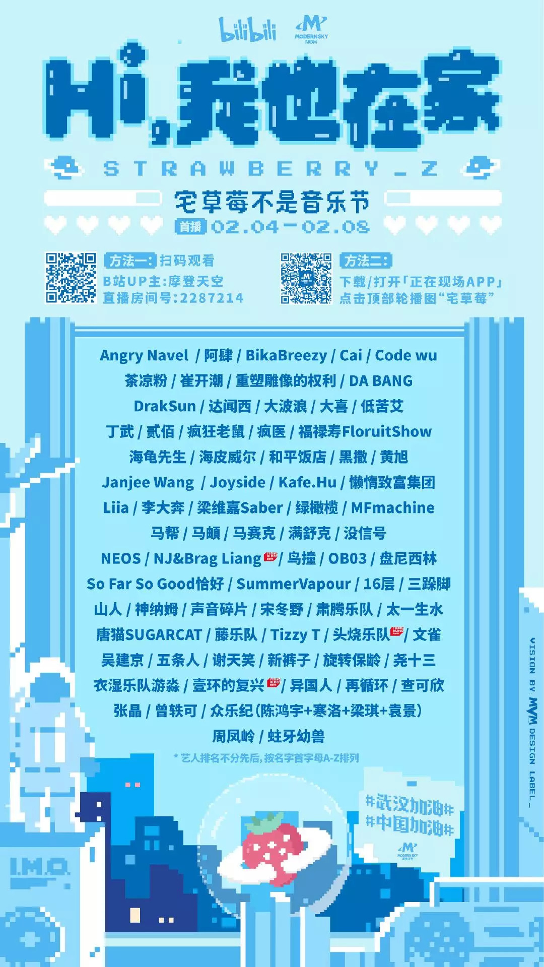 根据摩登天空在官方微博发布的节目单,此次“宅草莓不是音乐节”采取线上直播形式,新裤子、盘尼西林、海龟先生、曾轶可、黑撒、低苦艾、满舒克、Tizzy T等众多热门乐队和独立音乐人将与观众一起“云蹦迪”,播出内容包括自制和以往草莓音乐节现场录播内容两部分,播出平台除了B站还有摩登天空旗下的票务及视听平台“正在现场”。