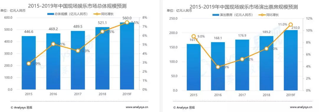 易观数据显示,2019年,中国现场娱乐的市场总体规模预计达到560亿,其中,现场娱乐演出的票房规模预计达到210亿,增速预计为11%。