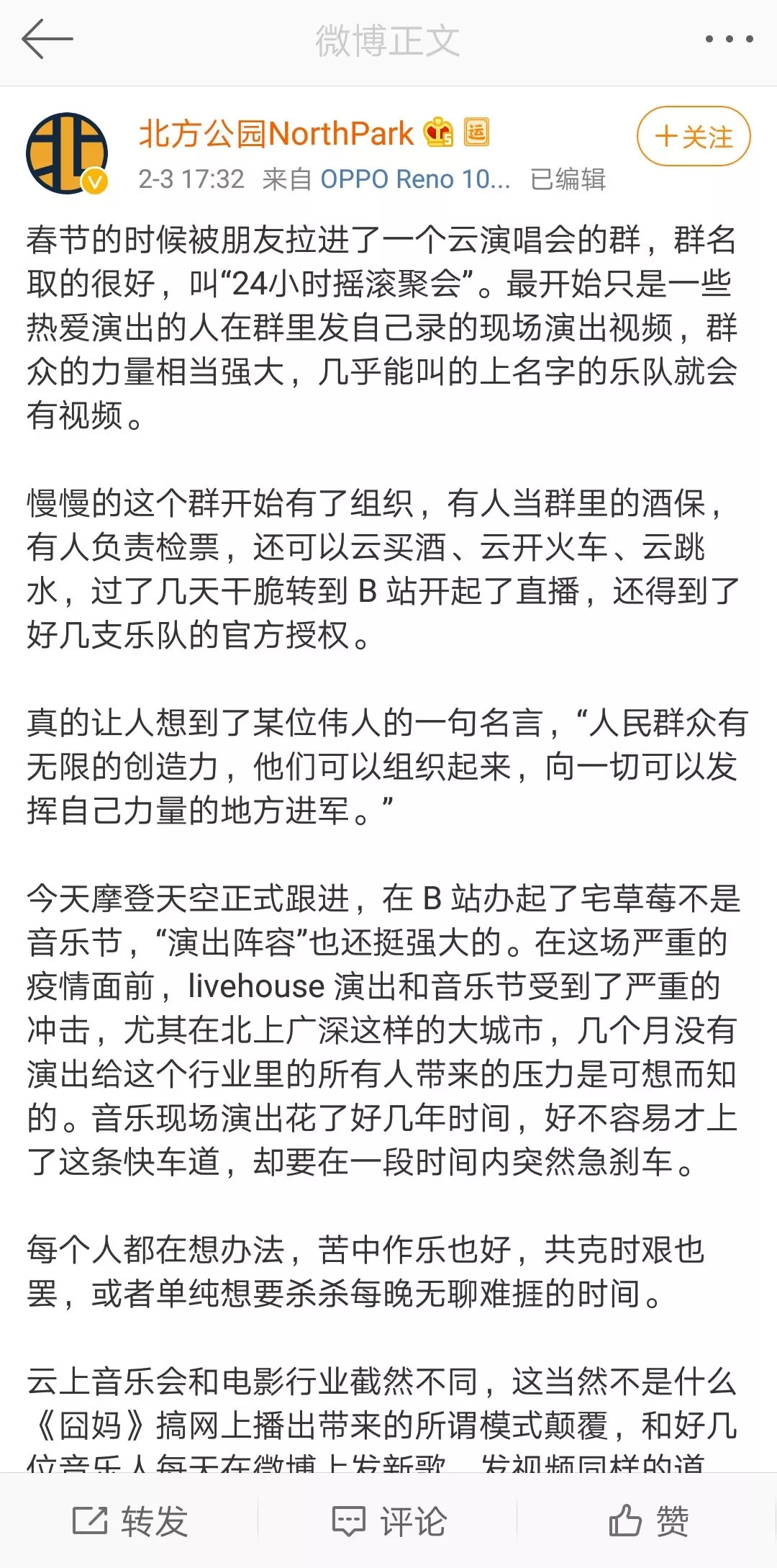 根据微博大V@北方公园NorthPark发布的内容,“云蹦迪”的最初形态是一个名为“云演唱会”的微信群,给热爱音乐现场却又不得不宅在家的人一个释放的空间,后来,微信群演变为B站的直播间,进而被摩登天空正式跟进,以线上音乐节的形态面向更大的市场。