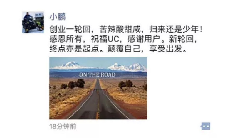 “创业一轮回,苦辣酸甜咸,归来还是少年!感谢所有,祝福UC,感谢用户。新轮回,终点亦是起点,颠覆自己,享受出发。”离别之际,何小鹏在个人微信和微博上发出感慨。