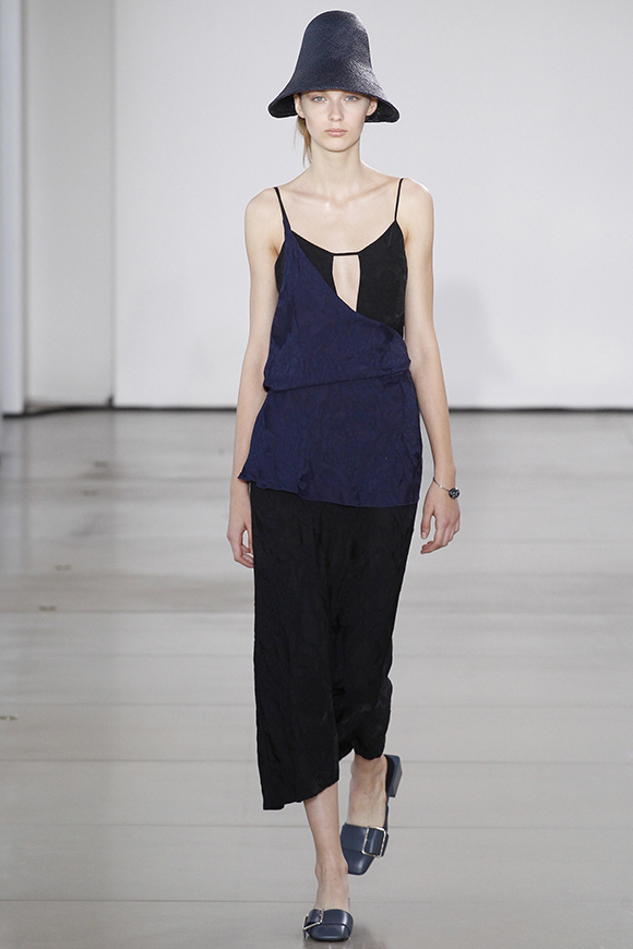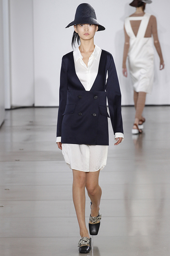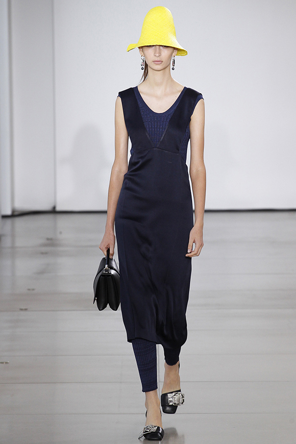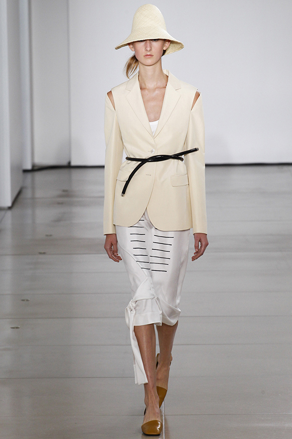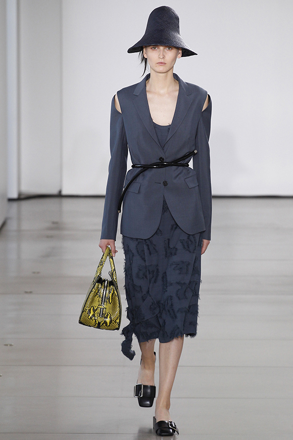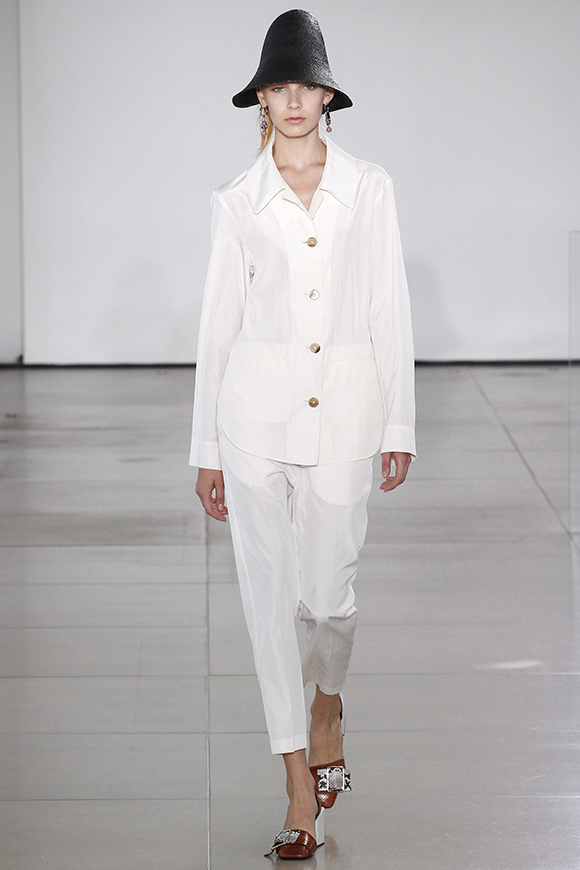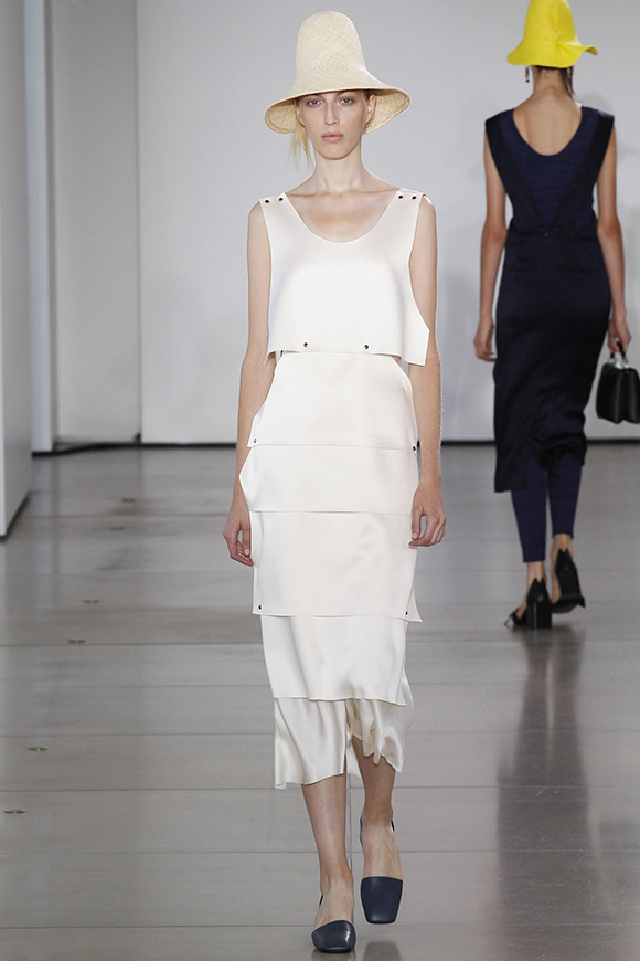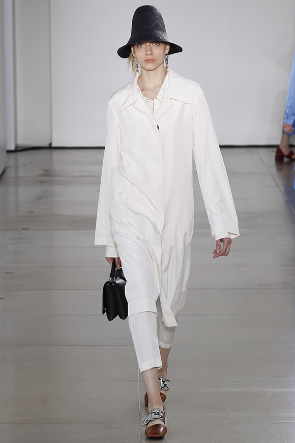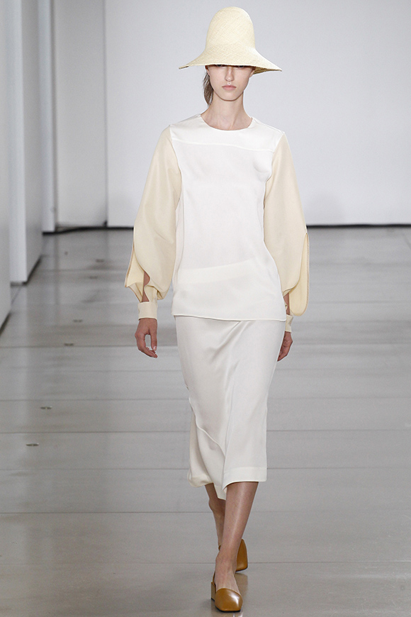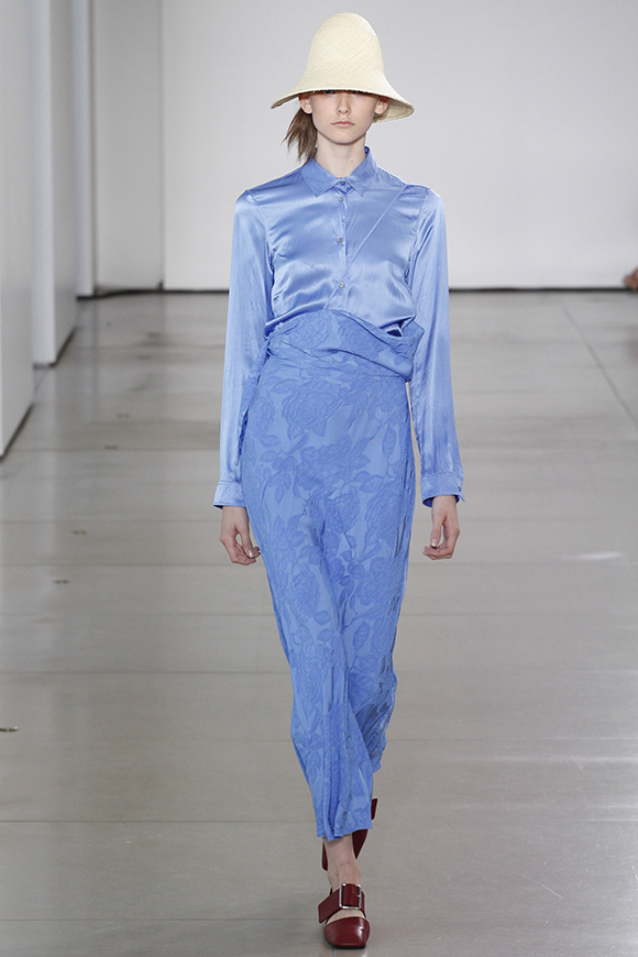 这一季Jil Sander灵感来源于一场亚洲旅行,所以丝绸首次出现在服装中;我们能看到蓝、白色丝绸上衣和长褂,而设计师Rodolfo Paglialunga以不同的色系与长度渐进,不拘于正式;各色草帽也应景地出现在配饰中,大小可以按照一枚小小铆钉来调节。