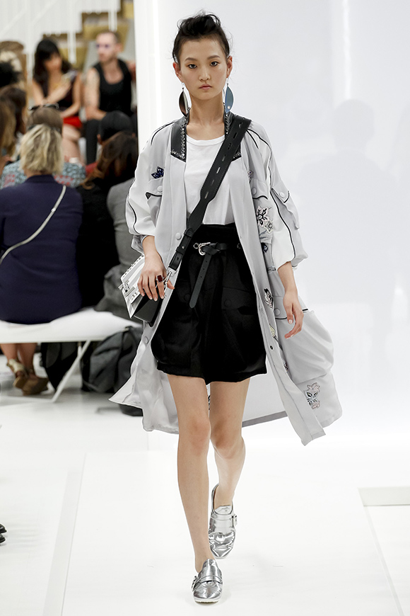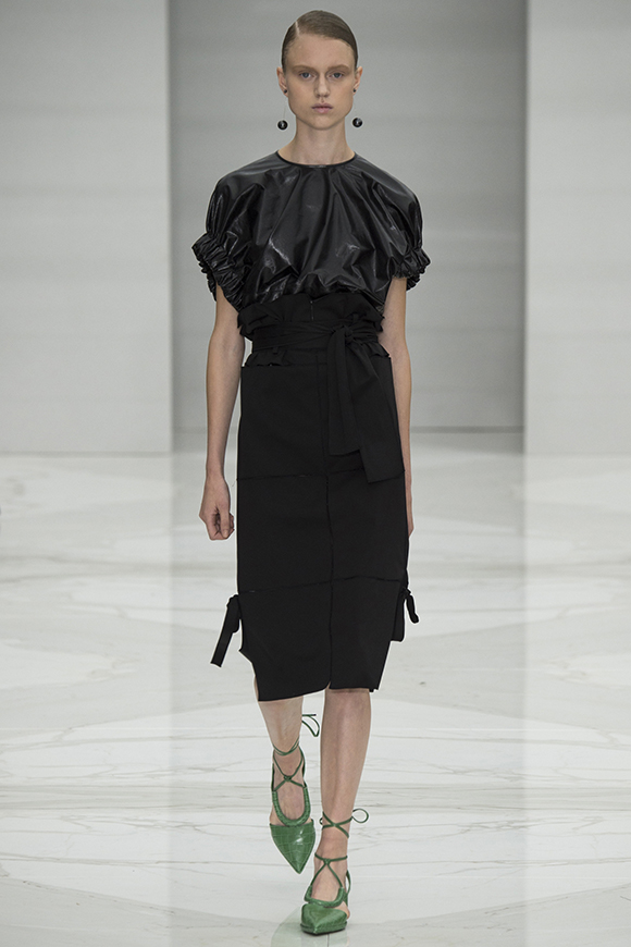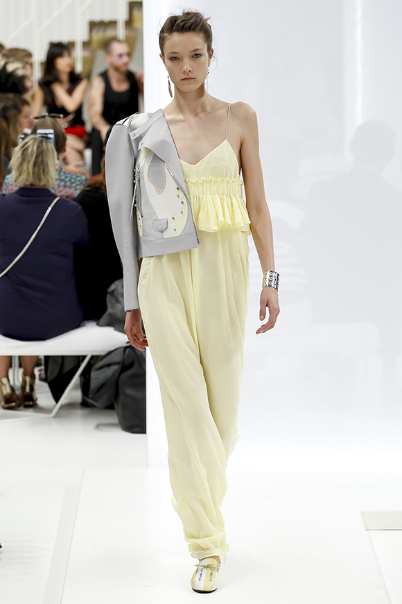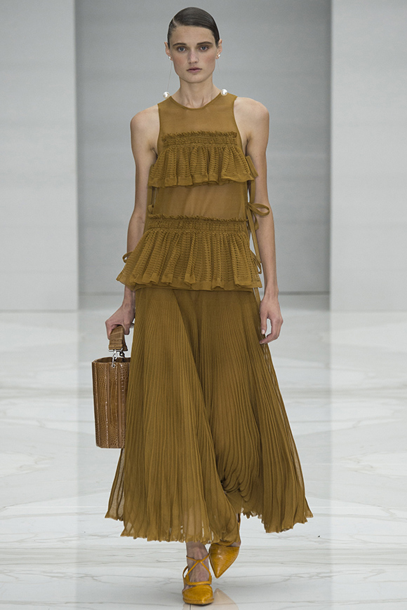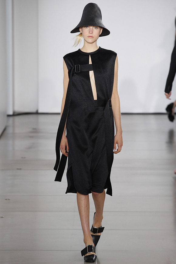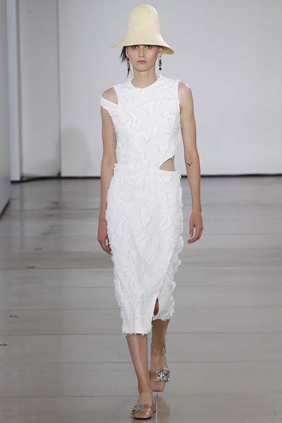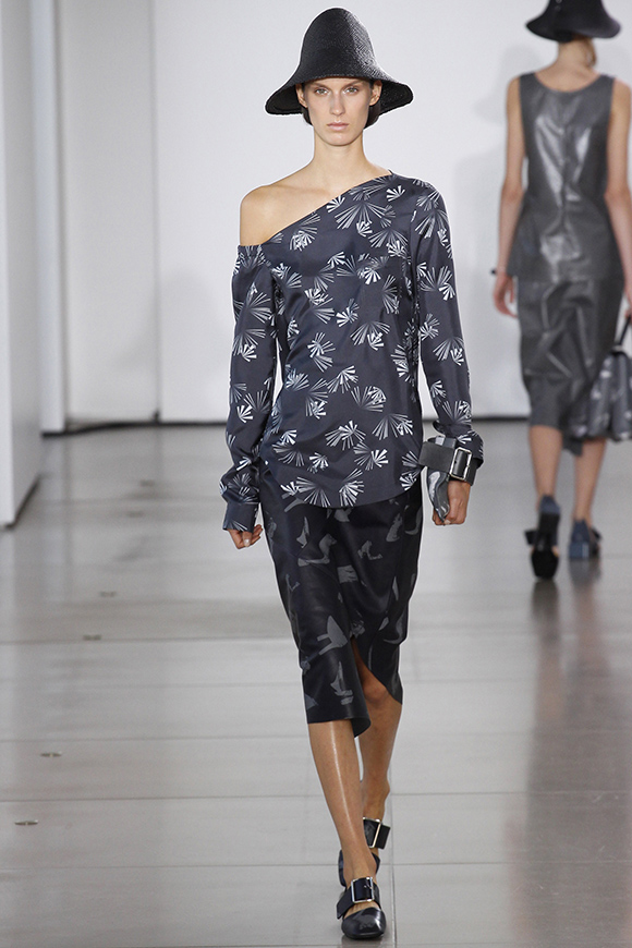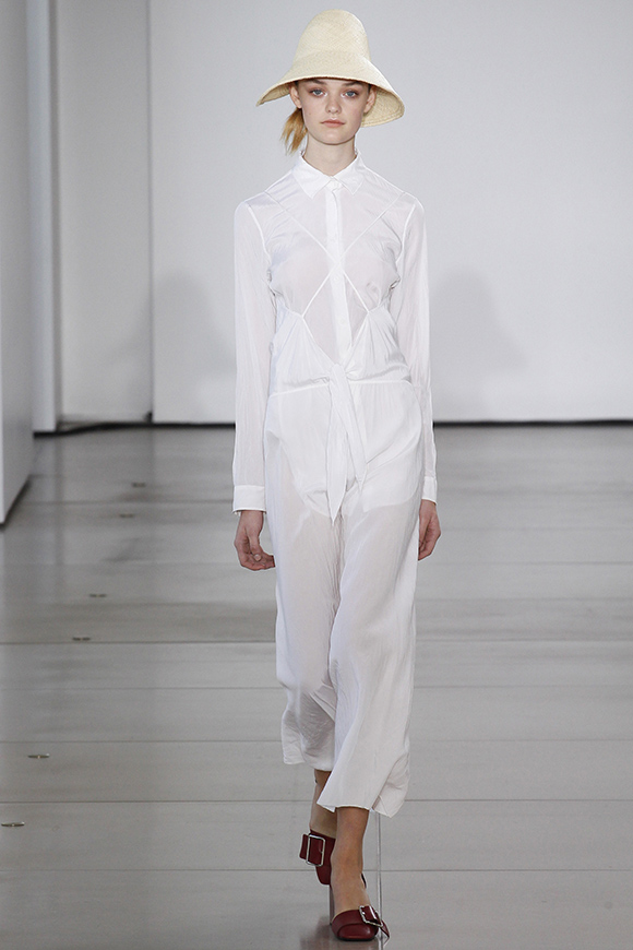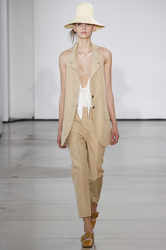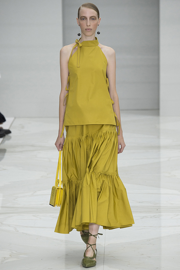 这一季Jil Sander灵感来源于一场亚洲旅行,所以丝绸首次出现在服装中;我们能看到蓝、白色丝绸上衣和长褂,而设计师Rodolfo Paglialunga以不同的色系与长度渐进,不拘于正式;各色草帽也应景地出现在配饰中,大小可以按照一枚小小铆钉来调节。