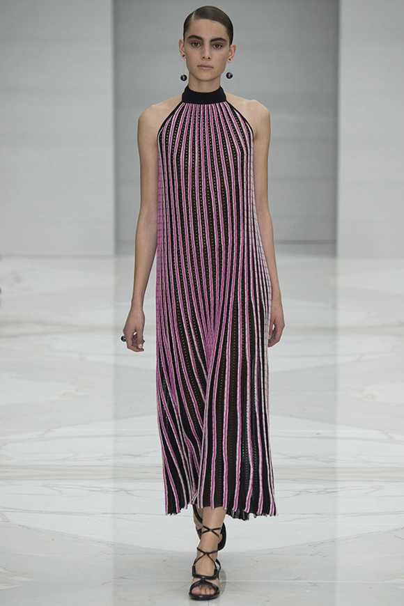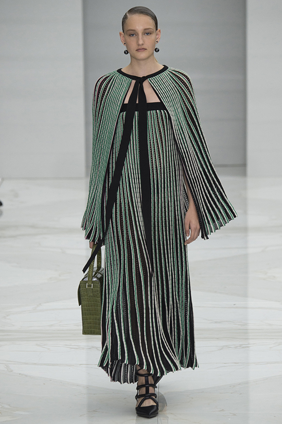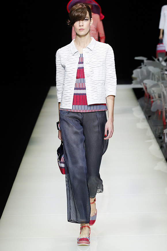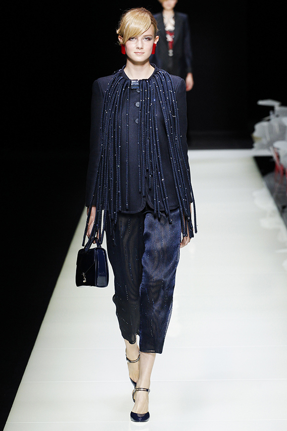 在这一场秀,Emporio Armani老爷子为职场女性提供了丰富的可能:电光蓝的秀场灯光打在挺括的欧根纱上,让利落的阔腿裤更加棱角分明;几何图案、修身剪裁和条纹变化出现在最正统的女士西装版型上;面料以轻纱迎合季节,流苏设计搭配宽檐帽,显现出老爷子特别的心意。