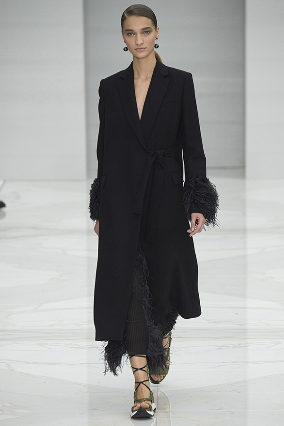 虽然系列出现的暖心姜黄色在努力否认——然而作为极简主义典范,Jil Sander本季还是一如既往的性冷淡:明晰的廓形,摒弃多余的装饰,以白蓝黑和裸色贯穿全场。