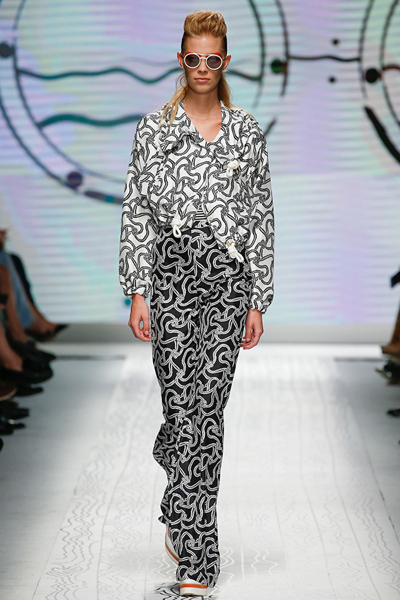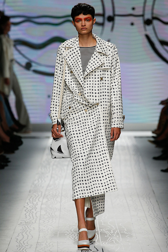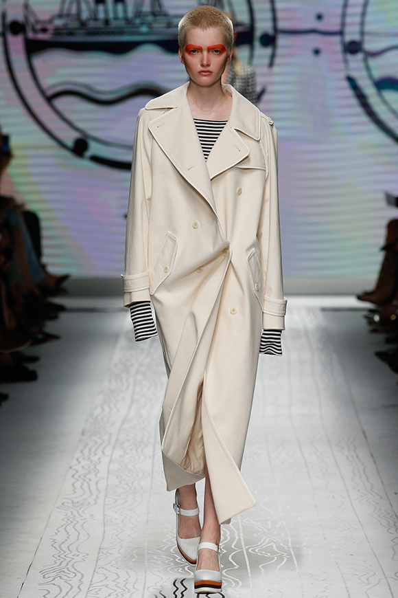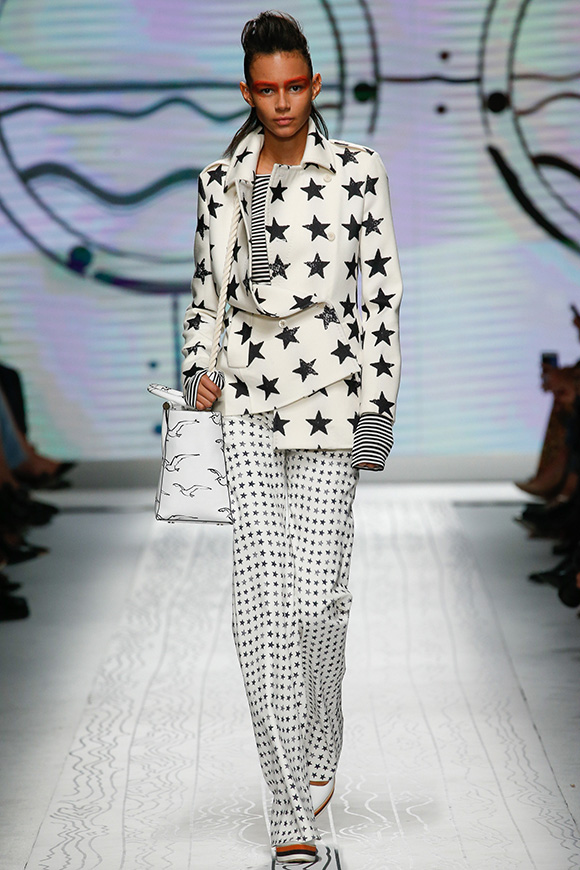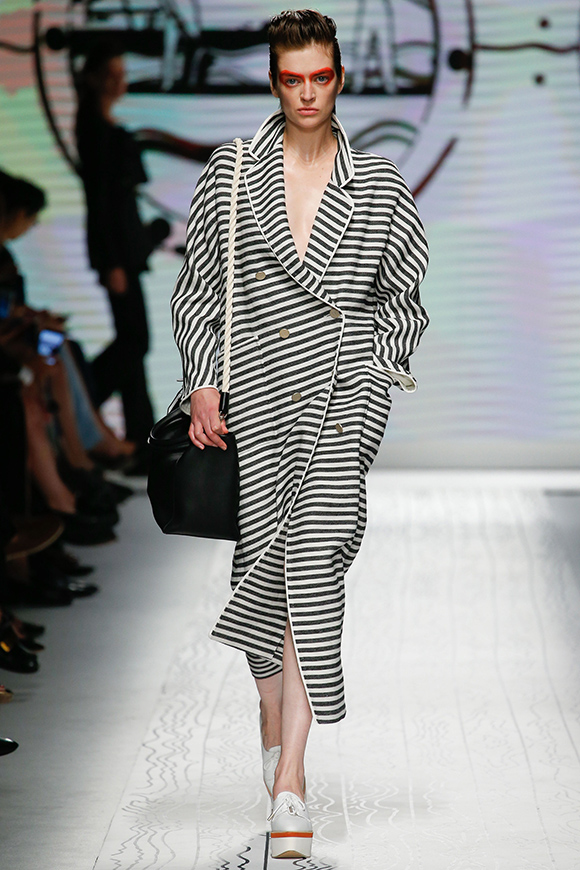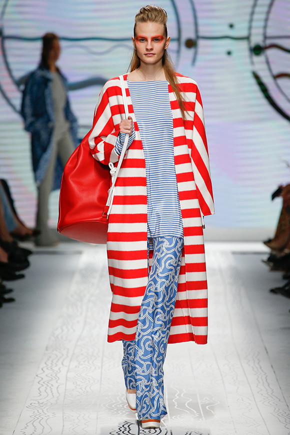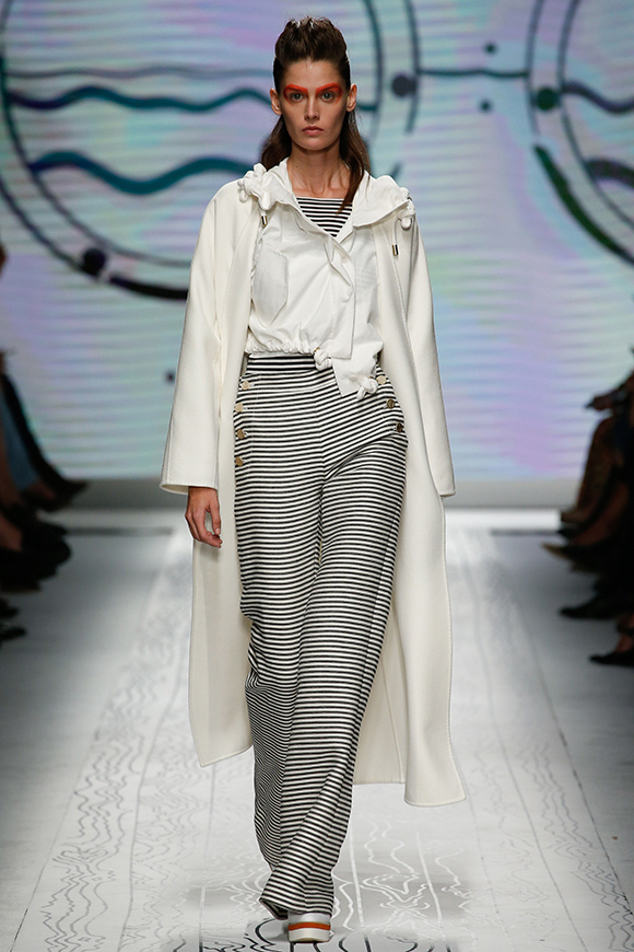 同样是以航海为主题,Max Mara却更加极简主义:利落的廓形配合海军条纹、五星和船只等元素,让Oversize大衣弥漫出轻松感和性冷淡;抽绳收口套装有点像睡衣;高腰阔腿裤跟H裙非常复古。
