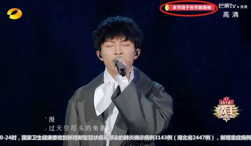 湖南卫视原定初七开播的《歌手·当打之年》与在延迟一周后终于迎来了开播,这也是近期“逆行”的一档王牌综艺节目。而在今天播出的节目中,节目组特意增加了角标,“本节目于春节前录制”。