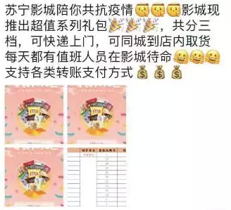 为了自救,2月6日起各地不少影院针对卖品推出了线上销售、线下配送的模式,或支持整箱批发、或支持拼单团购,通过影院微博、员工朋友圈等多渠道打广告,尽可能的降低库存。