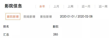 拓普数据显示,2020年目前新增影院共有285家,其中284家都集中在1月开业,2月新开的只有1家,可以说影院扩展陷入了停滞阶段,被疫情按下了“暂停键”。