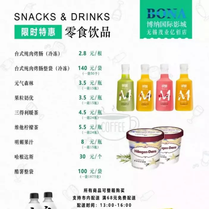 博纳影城无锡茂业店则打出了零食饮品的限时特惠价目表,包含烤肠、冰淇淋等零食饮料,标明商品可整箱购买、满68元免配送费。工作人员介绍,由于价格实惠,产品卖得还不错。