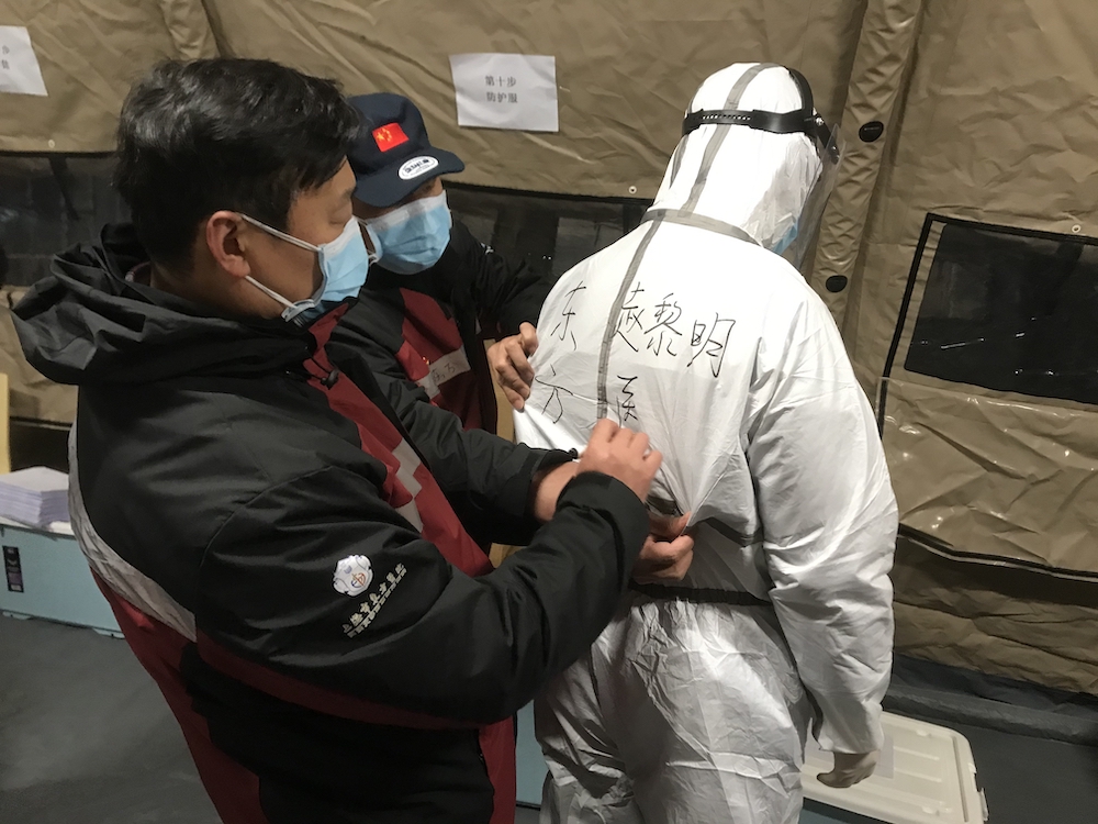 同华晶医生并肩作战的,是同济大学附属东方医院呼吸内科医生、中国国际应急医疗队(上海)队员赵黎明。2月9日也是他第二次进舱,从下午2点开始,一直工作到晚上9点半。“穿上这套防护服,手脚就是笨笨的。”他说。