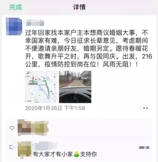 一条简短的朋友圈,一场推迟的婚礼。反映出在国家大义面前舍小家保大家的高尚情操,反映出新时代青年的责任与担当,虽然疫情防控工作形势严峻,但有广大人民群众的全力支持,就有理由坚信定会取得抗击新型冠状病毒肺炎疫情的胜利。