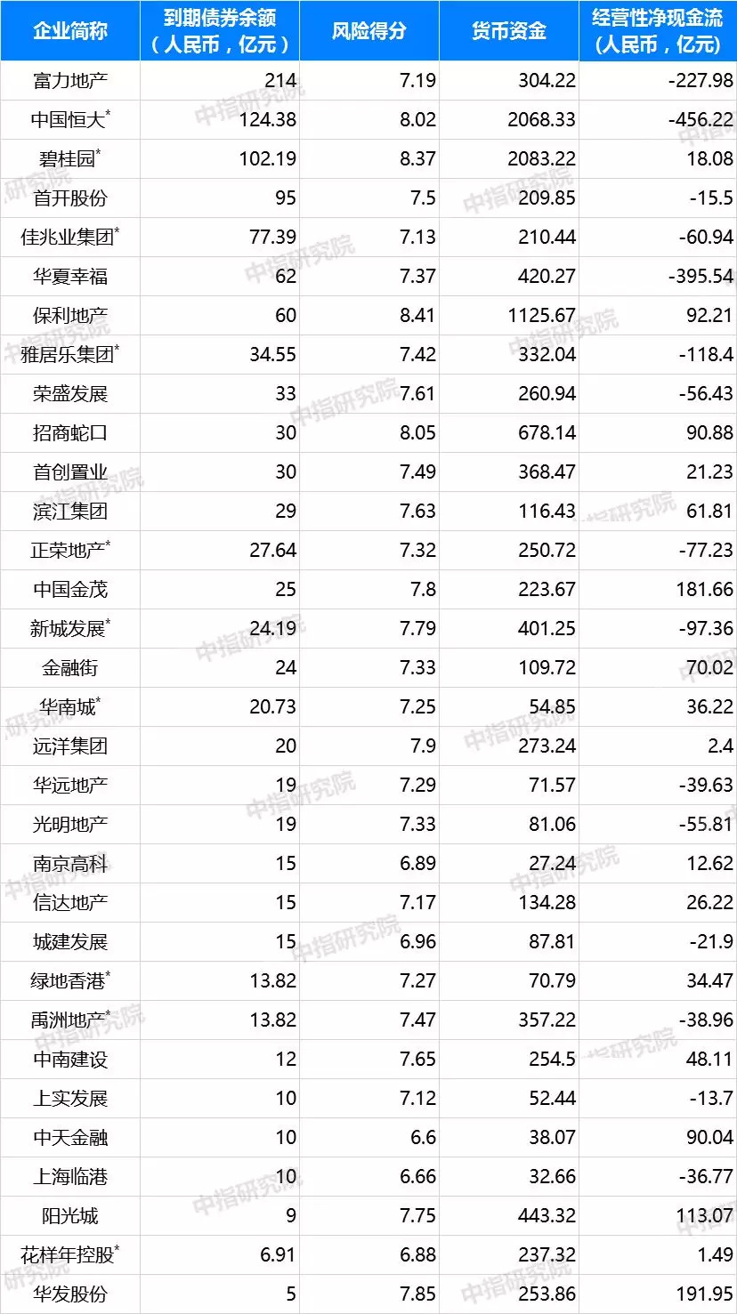 比如中指数据显示,未来的2月到6月,32家有债券短期内到期的企业中,15家经营性净现金流为负。像恒大和华夏幸福,都在负400亿上下;富力地产同样有负227.98亿元。