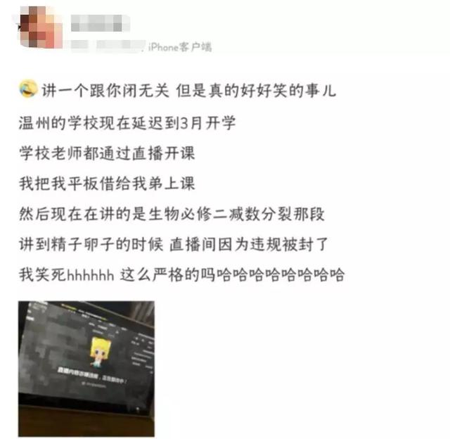 还有网友爆料,学校老师直播上生物课,在讲到精子卵子的时候,直播间因为违规被封禁,没想到如今的直播平台竟如此保守...