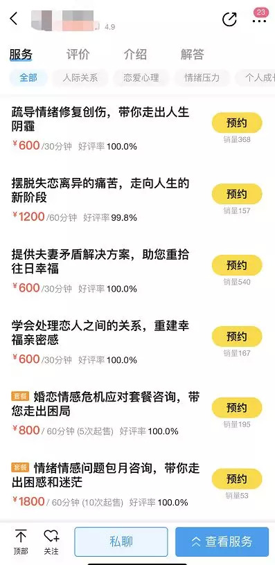 一是,咨询师和用户通过文字、语音、视频等进行一对一的有偿咨询,受咨询师的受训背景、咨询经验、所在地等因素的影响,不同咨询师的咨询价格也不尽相同,绝大多数咨询师一次的价格为400元至600元。