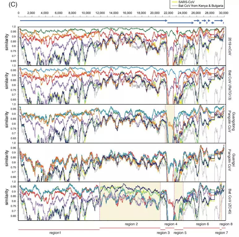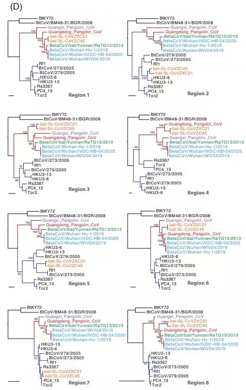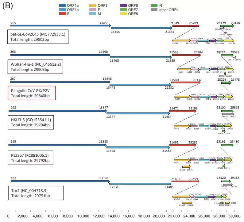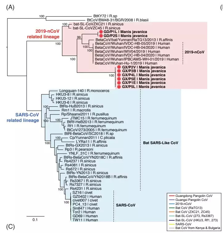 这些在穿山甲中发现的冠状病毒的基因组,与新型冠状病毒(SARS-CoV-2)基因组相似率在85.5%—92.4%,并在系统进化树中代表了新冠病毒的两个亚型,其中之一(GD/P1L和GD/P2S)与新冠病毒密切相关。