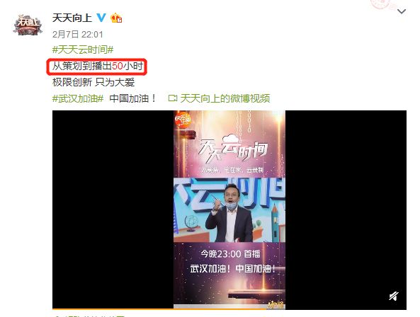 湖南卫视《嘿!你在干嘛呢》从立项到播出仅用5天时间;《天天云时间》则不到50小时;优酷的《好好吃饭》更是用了不到48小时就完成了从无到有的全过程。一位资深综艺制作人表示,在原有录制计划被打乱的情况下,“云综艺”的播出速度越快越能将损失降到最低,而且还能顺势拉一波外界好感。这也是各家迅速反应,加码“云综艺”的一个原因。