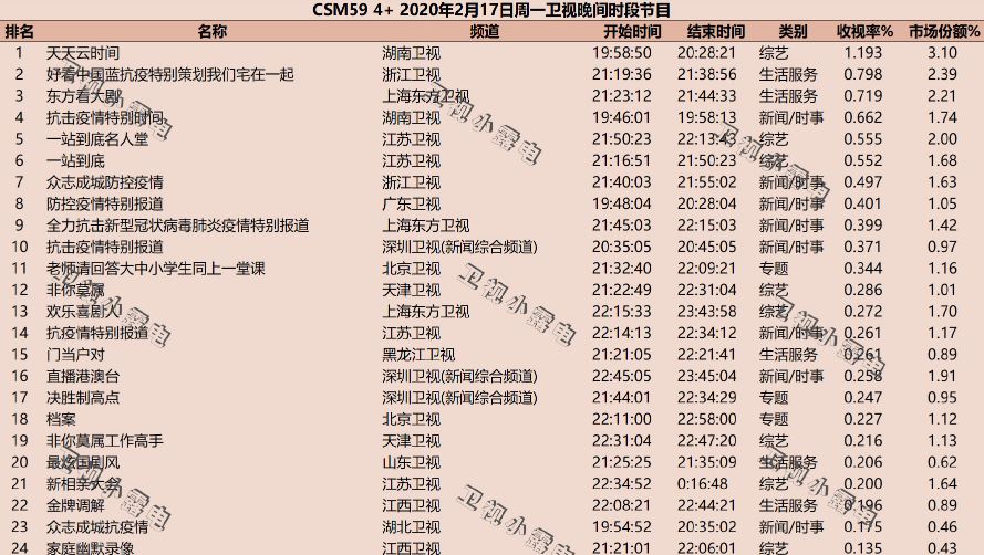 从播出情况看,虽然没了演播室的专业灯光与服化道,这一波“云综艺”的市场反馈都不错。CSM59城数据显示,2月17日,《天天云时间》与《我们宅在一起》两档节目收视率分别为1.193%与0.798%,占据卫视晚间时段节目排名前两位。