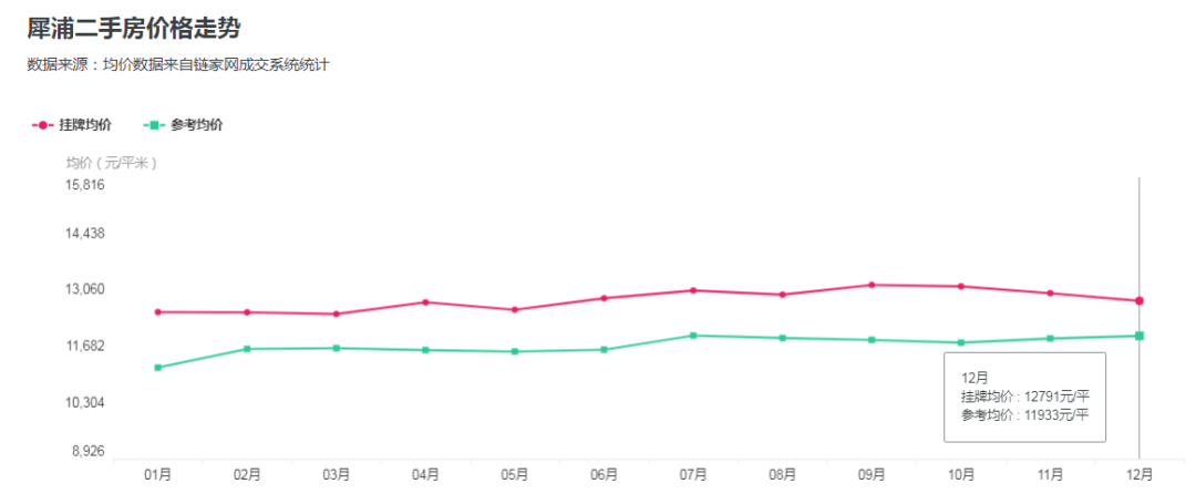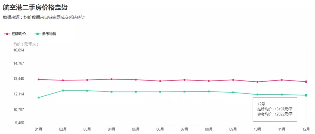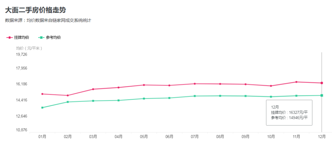 在二手房端口,根据链家网的数据,2019年自年初到年末,大面的二手房价格也完成了从13600元/㎡到14950元/㎡的上涨。