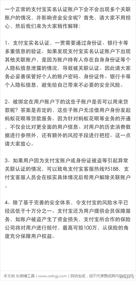 有位支付宝用户认为,未知账户的贷款也可能放在自己的实名信息之下,这也有可能出现别人来贷款、自己来还款的情况。支付宝表示,这些子账号无法借用户身份发起蚂蚁花呗等贷款服务。