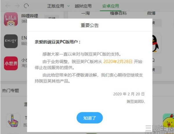 2月20日豌豆荚方面发布公告称,由于业务调整,豌豆荚PC版将从2020年2月28日开始停止在线服务的提供。而与豌豆荚同属阿里旗下的PP助手,也在本月早些时候发布公告称,将于2020年2月28日正式下线iOS版产品,其中包括PP助手iOS版、PP助手iOS PC版等。