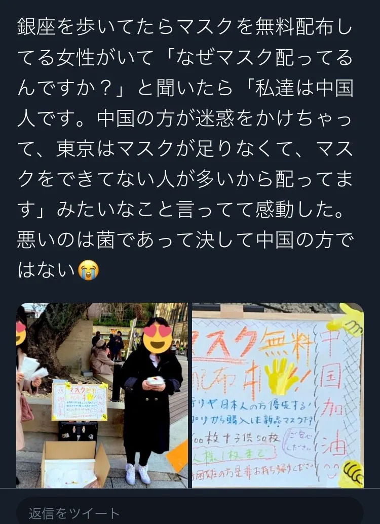 在疫情中,也有一些有担当的中国人站出来。有人在银座街头免费发放口罩,也有中国人在自己的公寓,给邻居们免费派发口罩。有人问在银座街头看到免费发放口罩的中国女生,为什么要这么做,她的回答是“我是中国人,因为中国的原因,现在东京很多人都买不到口罩了,所以想给大家发一点”。日本人对此的看法是,“不好的绝对不是中国人,而是病菌呀。”