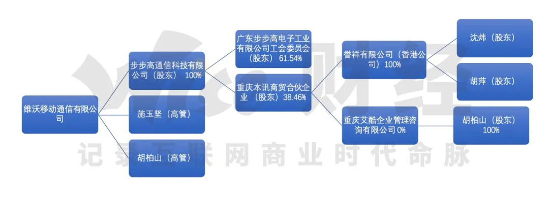 在维沃的股权体系中,包含占股100%的步步高通信科技公司,在步步高通信科技公司中又包含占股61.54%的广东步步高电子工业公司工会委员会,以及占股38.46%的重庆本讯商贸合伙企业。