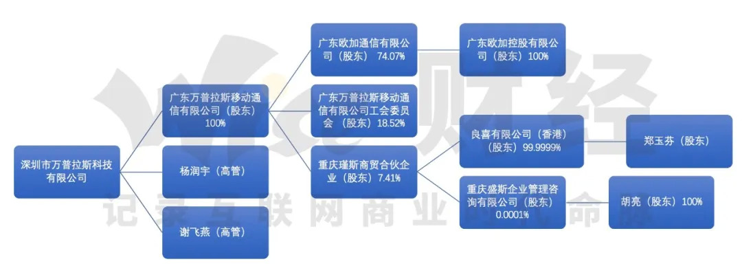 在万普拉斯(一加)股权体系中,包含占股100%的广东万普拉斯移动通信公司,在广东万普拉斯移动通信公司中又包含占股74.07%的广东欧加通信有限公司、占股18.52%的广东万普拉斯移动通信公司工会委员会,以及占股7.41%的重庆瑾斯商贸合伙企业。