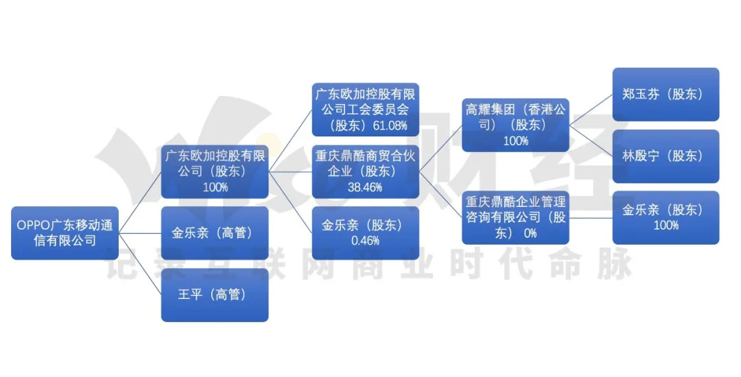 在OPPO的股权体系中,包含占股100%的广东欧加控股,在欧加控股中又包含占股61.08%的广东欧加工会委员会,占股38.46%的重庆鼎酷商贸公司,以及占股0.46%的股东金乐亲。